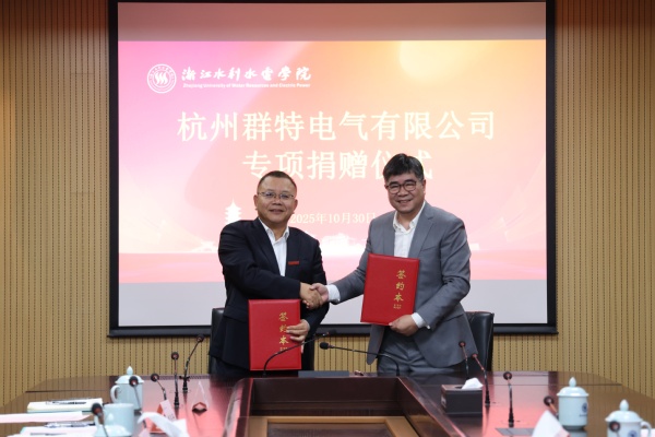 10月30日,杭州群特电气有限公司专项捐赠仪式在钱塘校区举行。杭州群特电气有限公司总经理丁建军、副总经理张仕权,学校副校长沈自力,电气学院、社合办相关负责人出席仪式。仪式由社合办主任胡吕平主持。